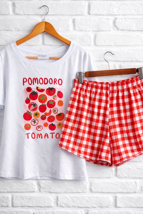 Cada conjunto combina shorts a cuadros en diferentes colores con remeras ilustradas con frases y detalles inspirados en Italia.